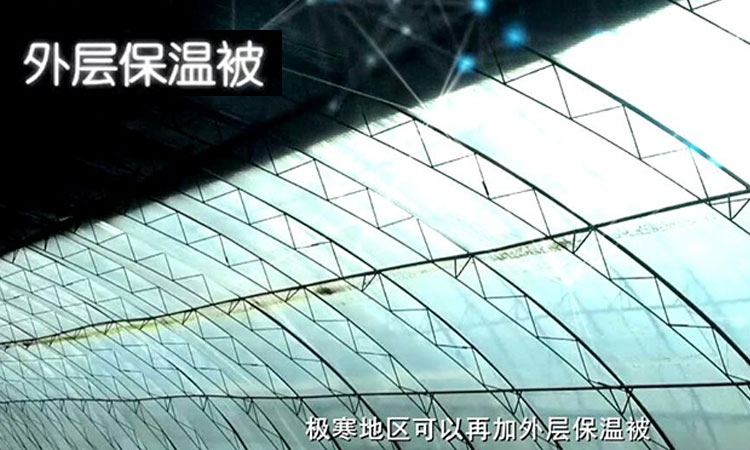 內保溫日光溫室采用新型防水保溫覆蓋材料,導熱系數僅為0.038W/(㎡·K),內置的保溫被不受雨雪風和太陽直射的影響,使用壽命延長。冬季降雪時,積雪落在外棚膜上可以自動滑落。避免雪災危害,極寒地區可以再加外層保溫被,形成雙層保溫被,作物可以安全越冬。