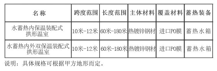 水蓄熱內(nèi)(雙)保溫裝配式拱形溫室配套設(shè)備包括:溫室主體、拱形骨架系統(tǒng)、外膜系統(tǒng)、內(nèi)膜系統(tǒng)、放風(fēng)系統(tǒng)、內(nèi)保溫系統(tǒng)、外保溫系統(tǒng)、新型水蓄熱系統(tǒng)、安裝系統(tǒng)、供電系統(tǒng)。