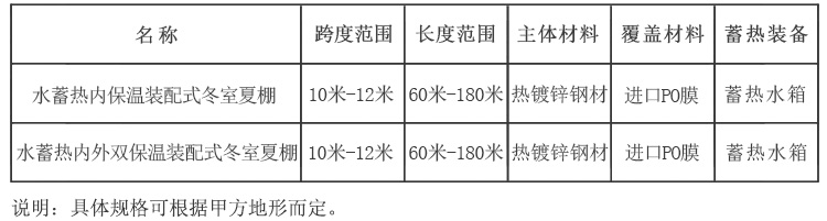 水蓄熱內(nèi)(雙)保溫裝配式冬室夏棚配套設(shè)備包括:溫室主體、骨架系統(tǒng)、外膜系統(tǒng)、內(nèi)膜系統(tǒng)、(前坡上、前坡下、后墻下)放風(fēng)系統(tǒng)、內(nèi)保溫系統(tǒng)、外保溫系統(tǒng)、后墻保溫系統(tǒng)、新型水蓄熱系統(tǒng)、安裝系統(tǒng)、供電系統(tǒng)。