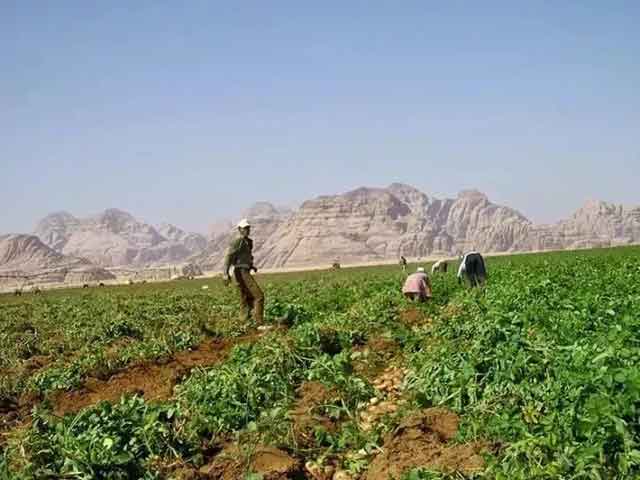 種植者從百米深的地下含水層中抽取水,利用噴嘴對圓形農田進行灌溉,這樣可以較大限度節省水源。這里種植的種類包括茄子、卷心菜、無花果、石榴、馬鈴薯、南瓜、西紅柿等多種蔬菜。農場的技術相當成功,使得目前該農場生產著約旦大部分的糧食。